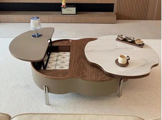 Multi-functional Coffee Tables: Modern living spaces often call for functional designs, making tables with storage compartments, drawers, or adjustable heights a favorite. These designs serve both as a tabletop and storage solution, perfect for smaller spaces or multifunctional areas.